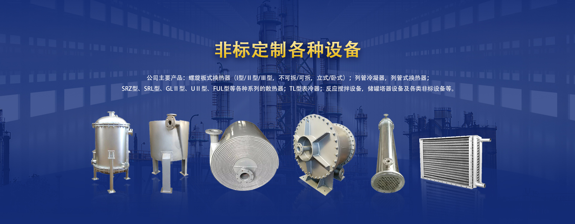 公司主要產(chǎn)品:螺旋板式換熱器(I型/Ⅱ型/Ⅲ型,不可拆/可拆,立式/臥式);列管冷凝器,列管式換熱器;SRZ型、SRL型、GLⅡ型、UⅡ型、FUL型等各種系列的散熱器;TL型表冷器;反應(yīng)攪拌設(shè)備,儲(chǔ)罐塔器設(shè)備及各類非標(biāo)設(shè)備等。